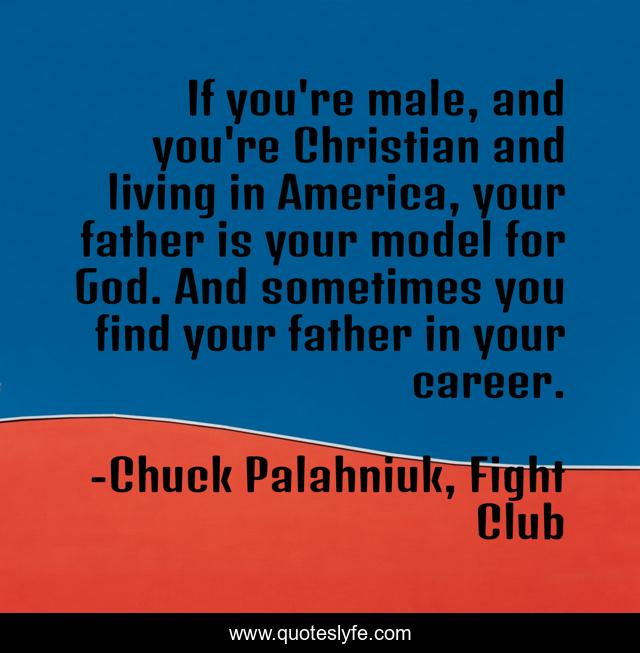 This page presents the quote "If you're male, and you're Christian and living in America, your father is your model for God. And sometimes you find your father in your career.". Author of this quote is Chuck Palahniuk, Fight Club. This quote is about career, god, father,.