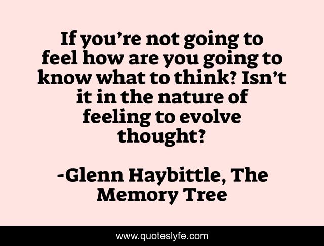 This page presents the quote "If you’re not going to feel how are you going to know what to think? Isn’t it in the nature of feeling to evolve thought?". Author of this quote is Glenn Haybittle, The Memory Tree. .
