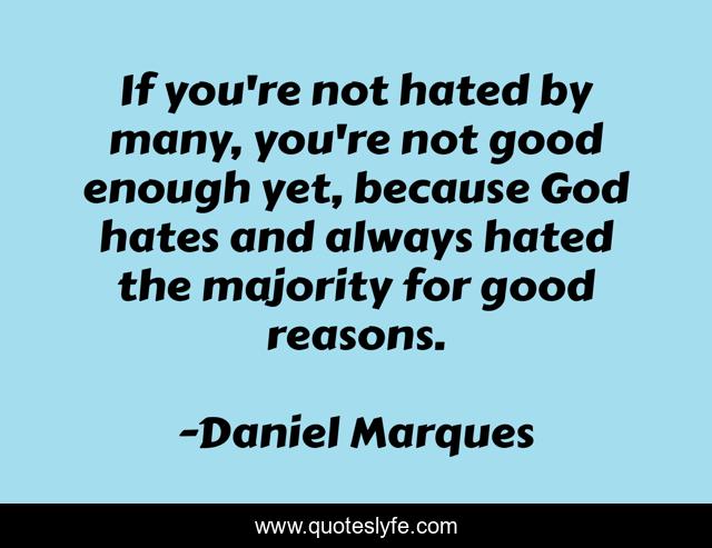 This page presents the quote "If you're not hated by many, you're not good enough yet, because God hates and always hated the majority for good reasons.". Author of this quote is Daniel Marques. This quote is about quote, quotes-to-live-by,.