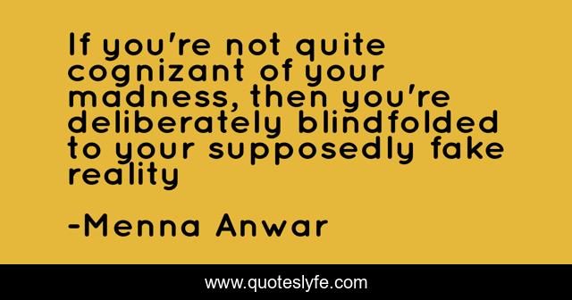 This page presents the quote "If you're not quite cognizant of your madness, then you're deliberately blindfolded to your supposedly fake reality". Author of this quote is Menna Anwar. .