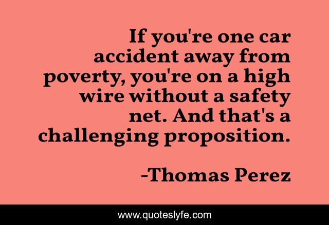 This page presents the quote "If you're one car accident away from poverty, you're on a high wire without a safety net. And that's a challenging proposition.". Author of this quote is Thomas Perez. This quote is about safety, poverty,.