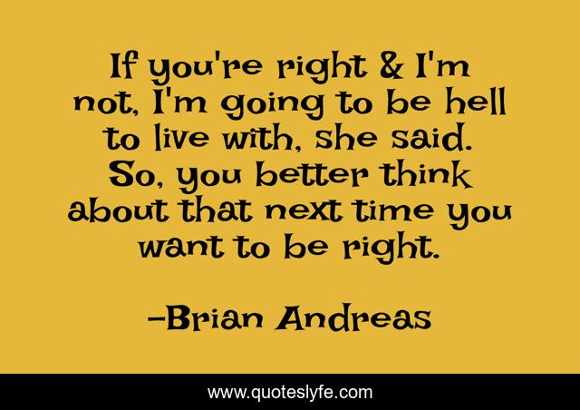 This page presents the quote "If you're right & I'm not, I'm going to be hell to live with, she said. So, you better think about that next time you want to be right.". Author of this quote is Brian Andreas. This quote is about relationships, humor, story-people,.