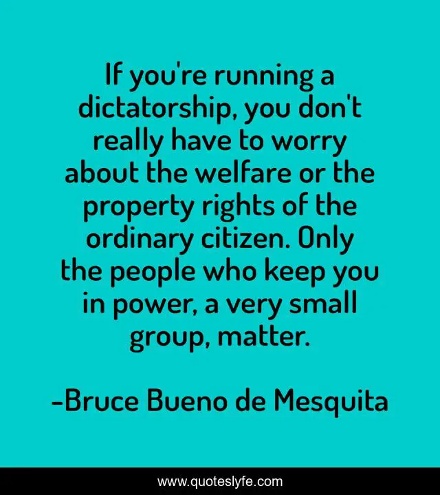 This page presents the quote "If you're running a dictatorship, you don't really have to worry about the welfare or the property rights of the ordinary citizen. Only the people who keep you in power, a very small group, matter.". Author of this quote is Bruce Bueno de Mesquita. This quote is about small, worry, people,.