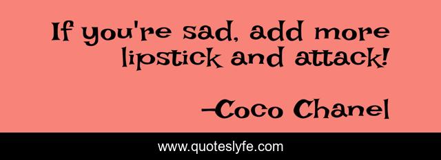 This page presents the quote "If you're sad, add more lipstick and attack!". Author of this quote is Coco Chanel. This quote is about confidence, women-s-inspirational, mothers-and-daughters, career, positive, motivational-for-women, motivational, wisdom, women-empowerment,.