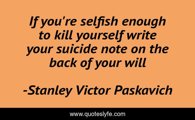 This page presents the quote "If you're selfish enough to kill yourself write your suicide note on the back of your will". Author of this quote is Stanley Victor Paskavich. This quote is about suicide, suicide-note, suicide-attempt, bipolar, ptsd, mental-illness,.