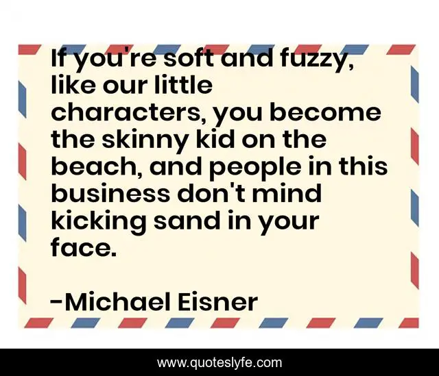 This page presents the quote "If you're soft and fuzzy, like our little characters, you become the skinny kid on the beach, and people in this business don't mind kicking sand in your face.". Author of this quote is Michael Eisner. This quote is about beach, mind, people,.