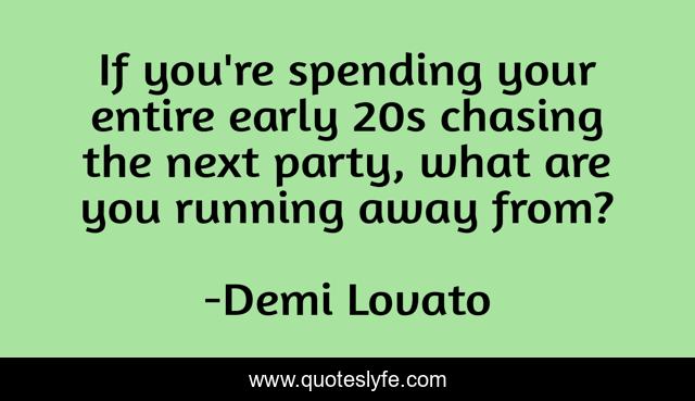 This page presents the quote "If you're spending your entire early 20s chasing the next party, what are you running away from?". Author of this quote is Demi Lovato. This quote is about party, running, young-adult, chasing,.