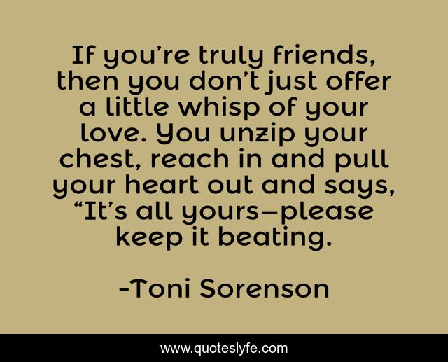 This page presents the quote "If you’re truly friends, then you don’t just offer a little whisp of your love. You unzip your chest, reach in and pull your heart out and says, “It’s all yours—please keep it beating.". Author of this quote is Toni Sorenson. .