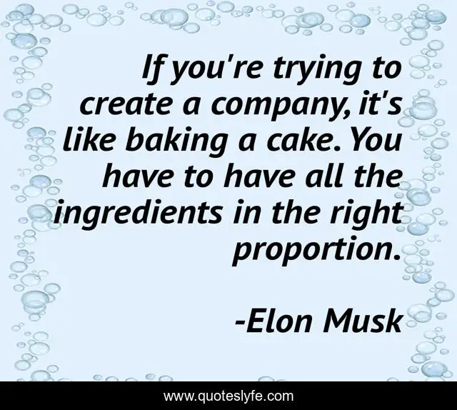 This page presents the quote "If you're trying to create a company, it's like baking a cake. You have to have all the ingredients in the right proportion.". Author of this quote is Elon Musk. This quote is about cake, company, baking,.