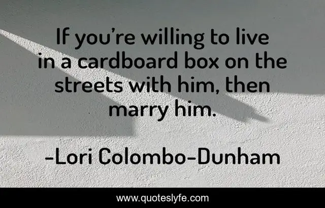 This page presents the quote "If you’re willing to live in a cardboard box on the streets with him, then marry him.". Author of this quote is Lori Colombo-Dunham. This quote is about relationships-love, love, commitment, marriage, fidelity, affection,.