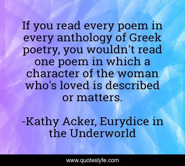 This page presents the quote "If you read every poem in every anthology of Greek poetry, you wouldn't read one poem in which a character of the woman who's loved is described or matters.". Author of this quote is Kathy Acker, Eurydice in the Underworld. This quote is about feminism, greek-poetry,.