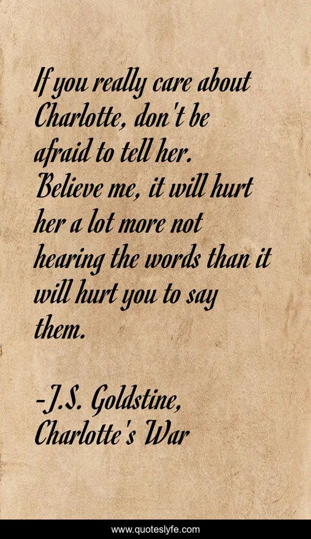 This page presents the quote "If you really care about Charlotte, don't be afraid to tell her. Believe me, it will hurt her a lot more not hearing the words than it will hurt you to say them.". Author of this quote is J.S. Goldstine, Charlotte's War. This quote is about life, love, people, hurt, fear, affection,.
