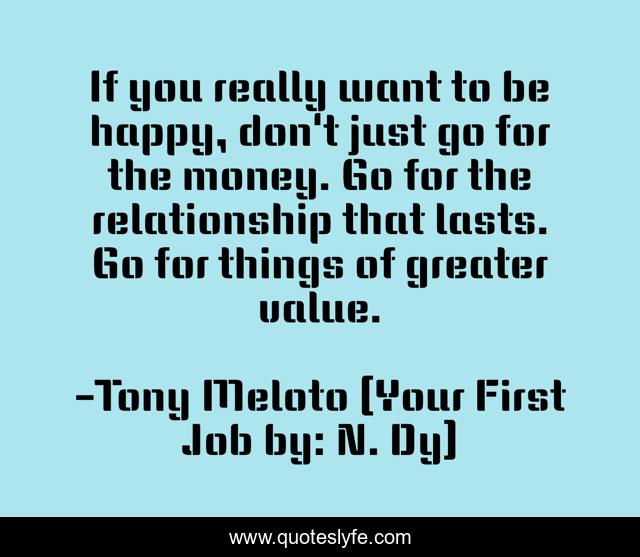 This page presents the quote "If you really want to be happy, don't just go for the money. Go for the relationship that lasts. Go for things of greater value.". Author of this quote is Tony Meloto (Your First Job by: N. Dy). This quote is about your-first-job, relationship, money, value, gk, inspirational, gawad-kalinga, nelson-dy, enthusiasm,.