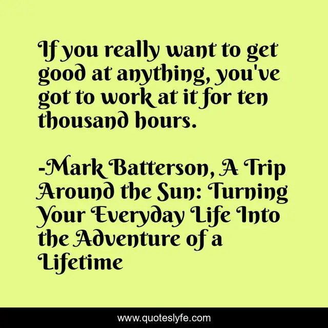 This page presents the quote "If you really want to get good at anything, you've got to work at it for ten thousand hours.". Author of this quote is Mark Batterson, A Trip Around the Sun: Turning Your Everyday Life Into the Adventure of a Lifetime. This quote is about practice, excellence,.
