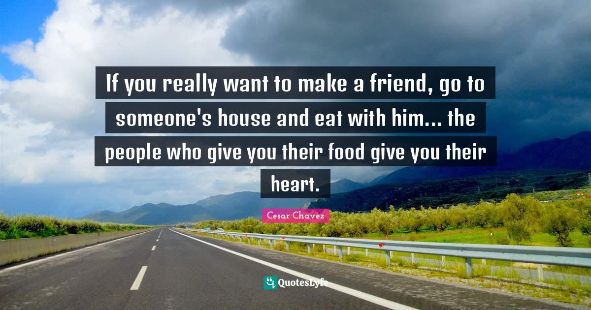 This page presents the quote "If you really want to make a friend, go to someone's house and eat with him... the people who give you their food give you their heart.". Author of this quote is Cesar Chavez. This quote is about heart, friend, people,.