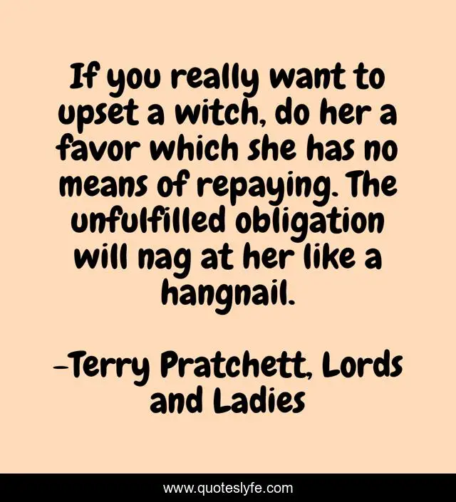 This page presents the quote "If you really want to upset a witch, do her a favor which she has no means of repaying. The unfulfilled obligation will nag at her like a hangnail.". Author of this quote is Terry Pratchett, Lords and Ladies. .
