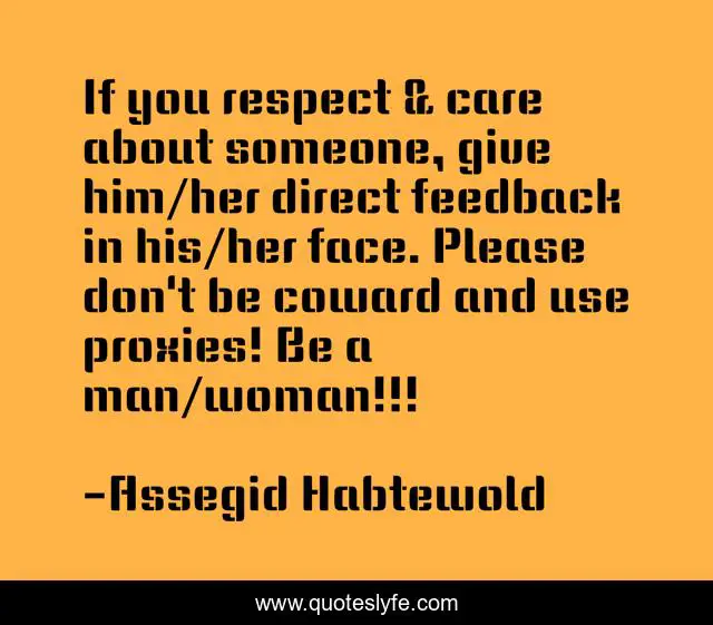 This page presents the quote "If you respect & care about someone, give him/her direct feedback in his/her face. Please don't be coward and use proxies! Be a man/woman!!!". Author of this quote is Assegid Habtewold. This quote is about feedback, coward, respect, proxies, assegid-habtewold, care,.
