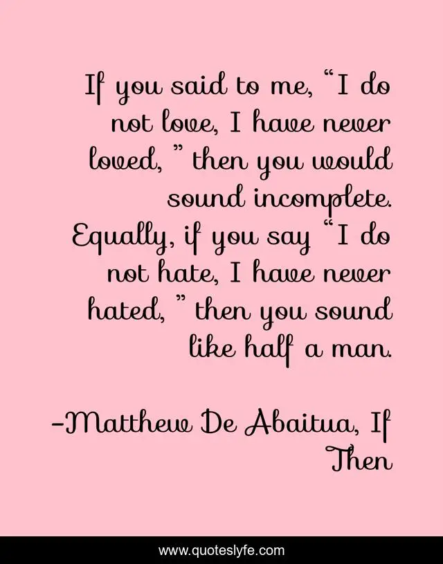 This page presents the quote "If you said to me, “I do not love, I have never loved, ” then you would sound incomplete. Equally, if you say “I do not hate, I have never hated, ” then you sound like half a man.". Author of this quote is Matthew De Abaitua, If Then. This quote is about hate, love, affection,.