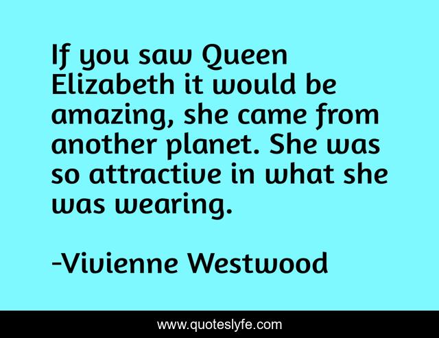 This page presents the quote "If you saw Queen Elizabeth it would be amazing, she came from another planet. She was so attractive in what she was wearing.". Author of this quote is Vivienne Westwood. This quote is about queen, she,.