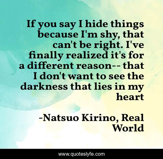 This page presents the quote "If you say I hide things because I'm shy, that can't be right. I've finally realized it's for a different reason-- that I don't want to see the darkness that lies in my heart". Author of this quote is Natsuo Kirino, Real World. This quote is about hiding-things, darkness,.
