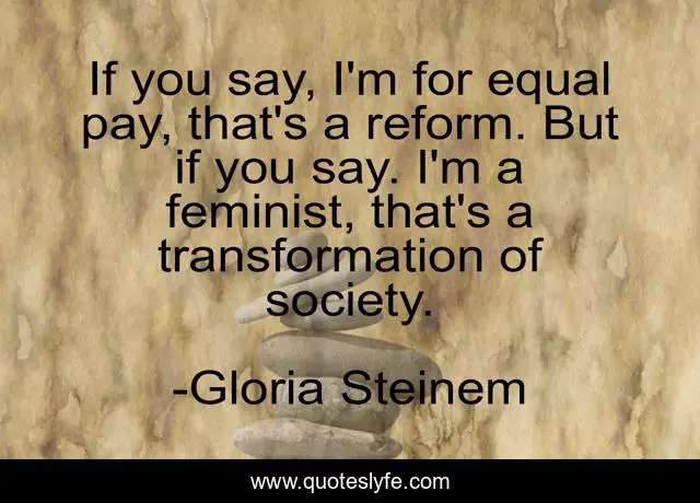 This page presents the quote "If you say, I'm for equal pay, that's a reform. But if you say. I'm a feminist, that's a transformation of society.". Author of this quote is Gloria Steinem. This quote is about transformation, equal,.