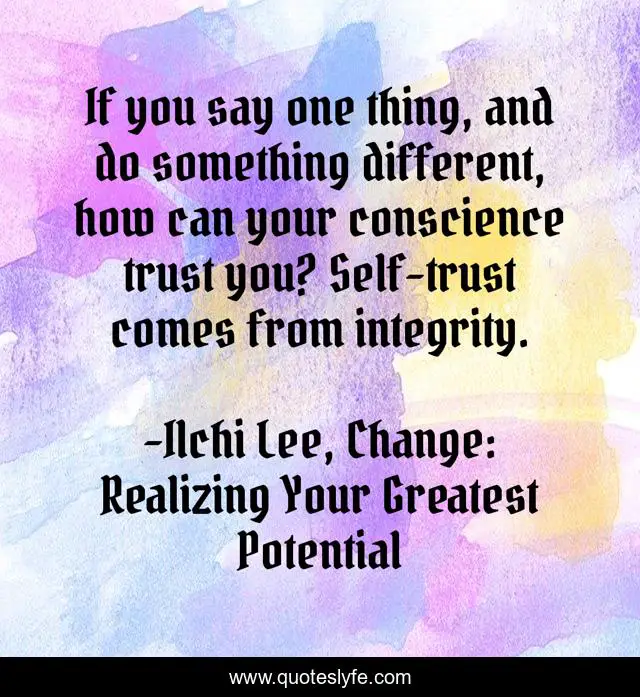 This page presents the quote "If you say one thing, and do something different, how can your conscience trust you? Self-trust comes from integrity.". Author of this quote is Ilchi Lee, Change: Realizing Your Greatest Potential. This quote is about self-realization, inspirational, enthusiasm,.