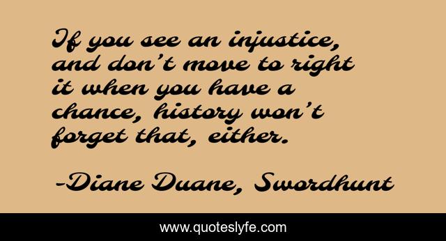 This page presents the quote "If you see an injustice, and don’t move to right it when you have a chance, history won’t forget that, either.". Author of this quote is Diane Duane, Swordhunt. This quote is about injustice, star-trek,.