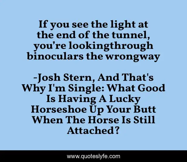 This page presents the quote "If you see the light at the end of the tunnel, you’re lookingthrough binoculars the wrongway". Author of this quote is Josh Stern, And That's Why I'm Single: What Good Is Having A Lucky Horseshoe Up Your Butt When The Horse Is Still Attached?. This quote is about funny, tunnel, light, end-humor, absurd, comedy, binocular-backwards,.
