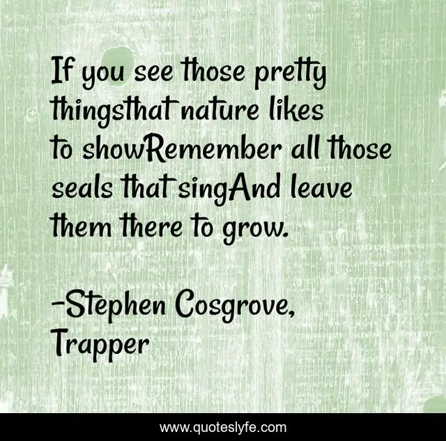 This page presents the quote "If you see those pretty thingsthat nature likes to showRemember all those seals that singAnd leave them there to grow.". Author of this quote is Stephen Cosgrove, Trapper. This quote is about lesson, beauty, nature,.