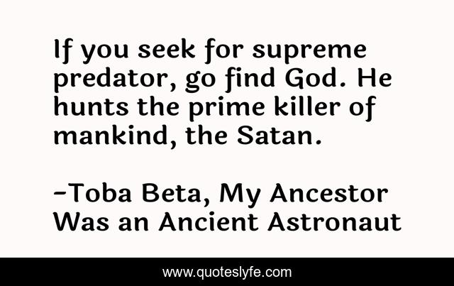 This page presents the quote "If you seek for supreme predator, go find God. He hunts the prime killer of mankind, the Satan.". Author of this quote is Toba Beta, My Ancestor Was an Ancient Astronaut. This quote is about life, devil, chain, food, god, hunter, predator, pyramid, mankind,.