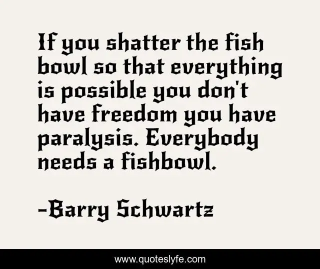 This page presents the quote "If you shatter the fish bowl so that everything is possible you don't have freedom you have paralysis. Everybody needs a fishbowl.". Author of this quote is Barry Schwartz. This quote is about freedom, happiness, possibility,.