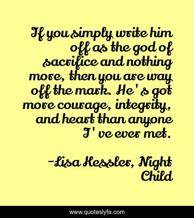 This page presents the quote "If you simply write him off as the god of sacrifice and nothing more, then you are way off the mark. He's got more courage, integrity, and heart than anyone I've ever met.". Author of this quote is Lisa Kessler, Night Child. This quote is about romance, nightwalkers, urban-fantasy, paranormal,.
