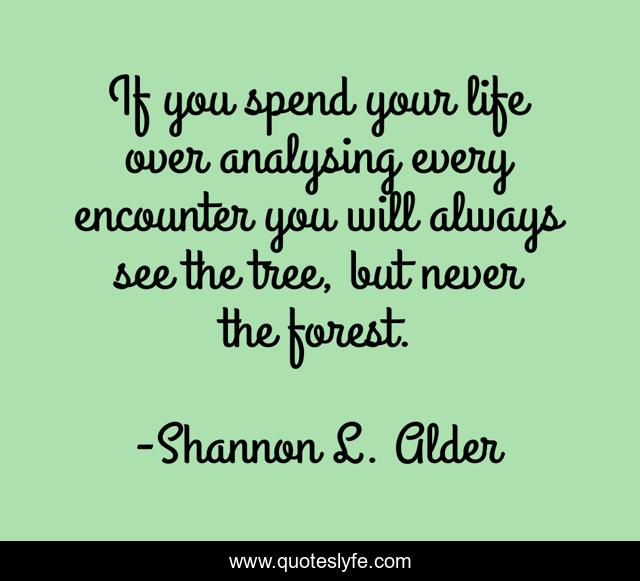 This page presents the quote "If you spend your life over analysing every encounter you will always see the tree, but never the forest.". Author of this quote is Shannon L. Alder. This quote is about big-picture, fear, overanalysis, overanalysing, perspective,.