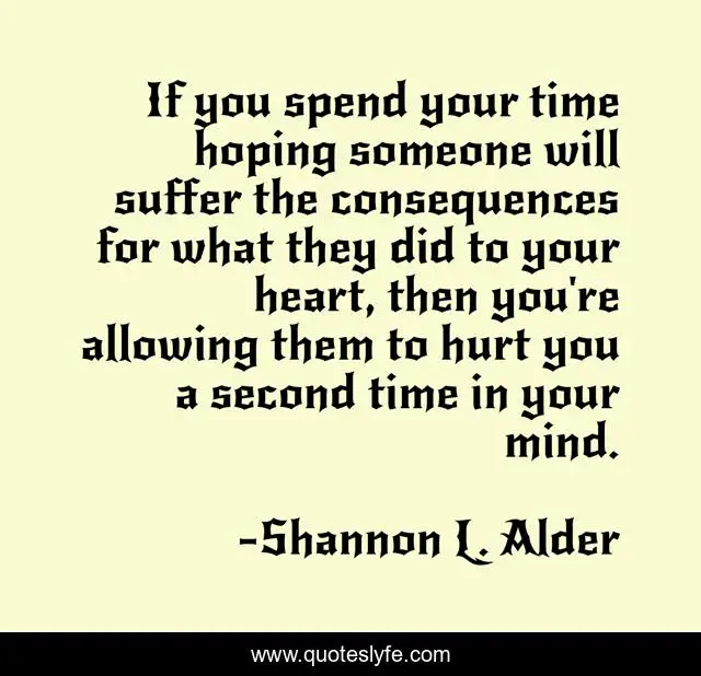 This page presents the quote "If you spend your time hoping someone will suffer the consequences for what they did to your heart, then you're allowing them to hurt you a second time in your mind.". Author of this quote is Shannon L. Alder. This quote is about relationships, love, consequences, justice, divorce, seperation, fights, betrayal, revenge,.