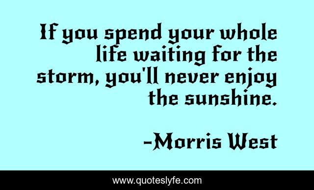 This page presents the quote "If you spend your whole life waiting for the storm, you'll never enjoy the sunshine.". Author of this quote is Morris West. This quote is about waiting, sunshine, storm,.