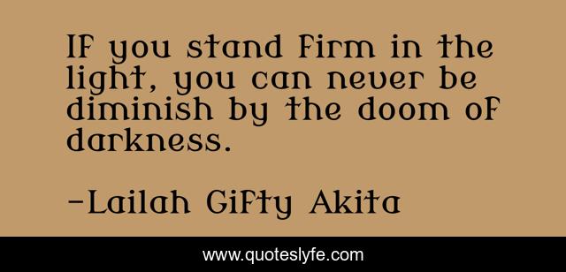 This page presents the quote "If you stand firm in the light, you can never be diminish by the doom of darkness.". Author of this quote is Lailah Gifty Akita. This quote is about faith, inspiring, darkness, light, positive-thinking, firmness, self-help,.