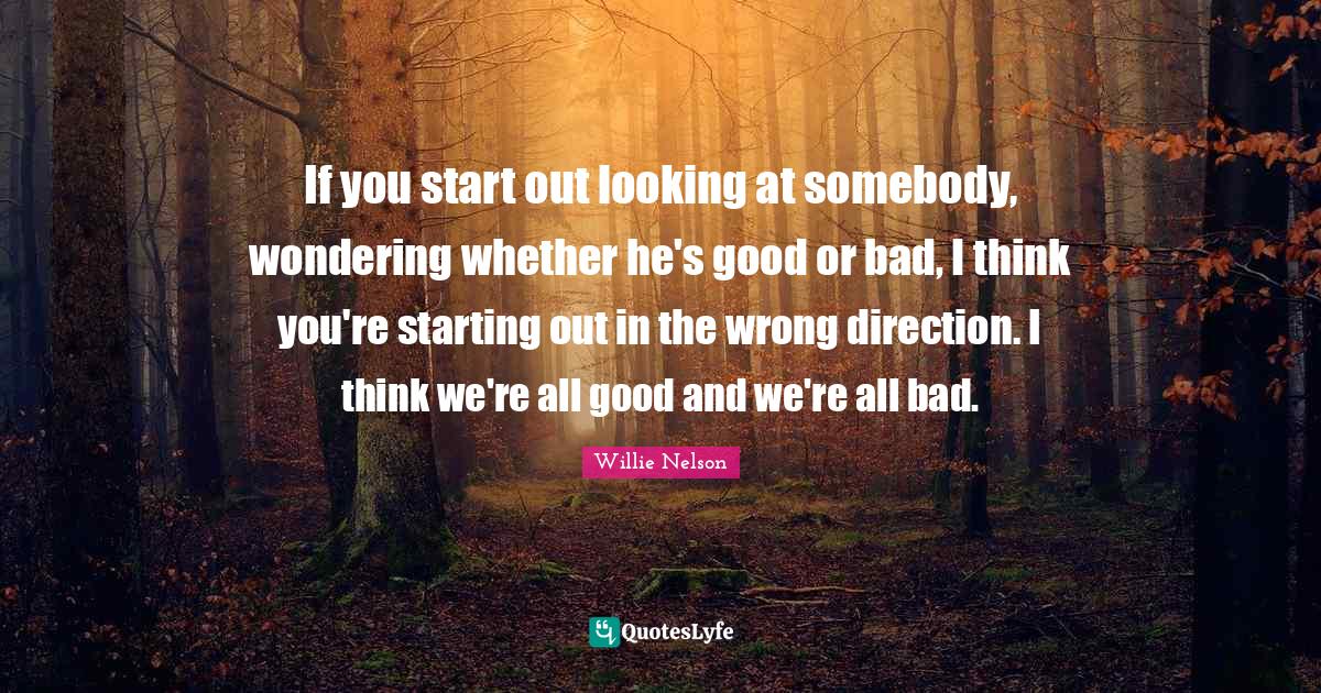 This page presents the quote "If you start out looking at somebody, wondering whether he's good or bad, I think you're starting out in the wrong direction. I think we're all good and we're all bad.". Author of this quote is Willie Nelson. This quote is about starting out, wonder, wrong direction, thinking,.