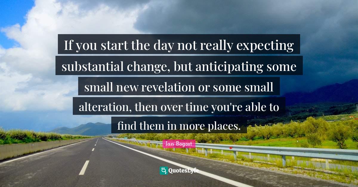 This page presents the quote "If you start the day not really expecting substantial change, but anticipating some small new revelation or some small alteration, then over time you're able to find them in more places.". Author of this quote is Ian Bogost. This quote is about time, start the day, able, expecting, change, revelations,.