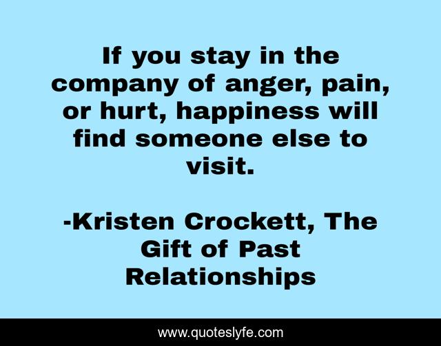 This page presents the quote "If you stay in the company of anger, pain, or hurt, happiness will find someone else to visit.". Author of this quote is Kristen Crockett, The Gift of Past Relationships. This quote is about relationships, love, affection, self-help,.