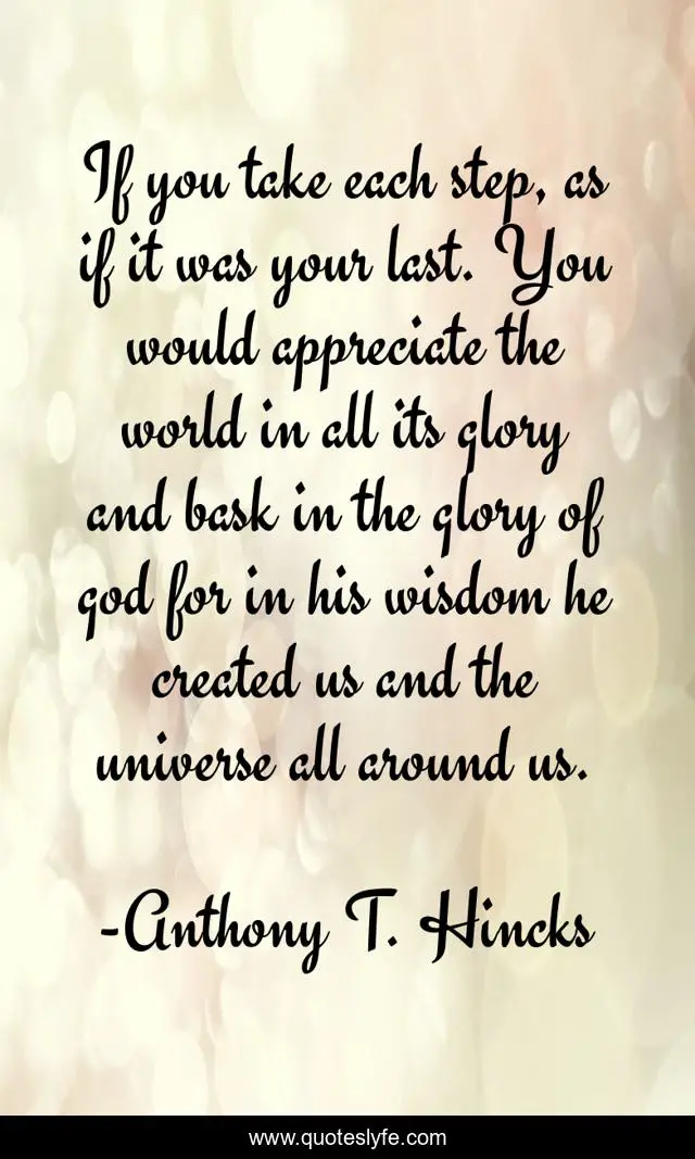 This page presents the quote "If you take each step, as if it was your last. You would appreciate the world in all its glory and bask in the glory of god for in his wisdom he created us and the universe all around us.". Author of this quote is Anthony T. Hincks. This quote is about glory, created, god, jesus, religion, step, philosophy-of-religion, wisdom, bask,.