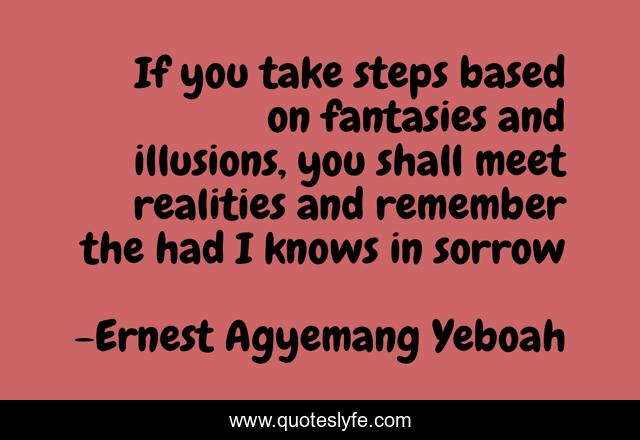 This page presents the quote "If you take steps based on fantasies and illusions, you shall meet realities and remember the had I knows in sorrow". Author of this quote is Ernest Agyemang Yeboah. This quote is about realities-of-life, facts-of-life, wrong-decisions, love, facts-and-ideas, facts, patience-and-timing, facing-facts, painful-past,.