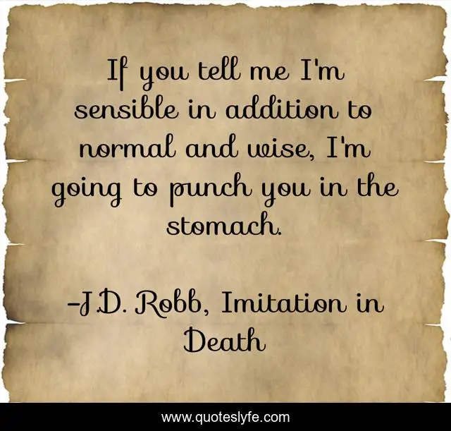 This page presents the quote "If you tell me I'm sensible in addition to normal and wise, I'm going to punch you in the stomach.". Author of this quote is J.D. Robb, Imitation in Death. .