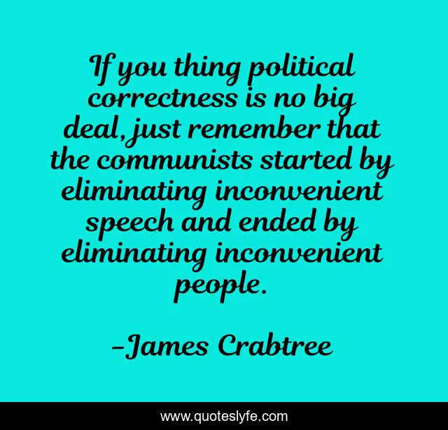 This page presents the quote "If you thing political correctness is no big deal, just remember that the communists started by eliminating inconvenient speech and ended by eliminating inconvenient people.". Author of this quote is James Crabtree. This quote is about political-correctness, communism,.