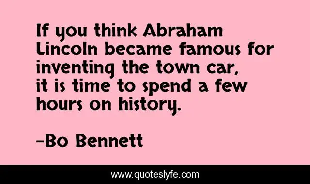 This page presents the quote "If you think Abraham Lincoln became famous for inventing the town car, it is time to spend a few hours on history.". Author of this quote is Bo Bennett. This quote is about car, time, history,.
