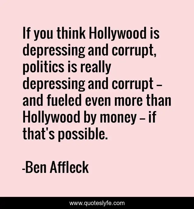 This page presents the quote "If you think Hollywood is depressing and corrupt, politics is really depressing and corrupt -- and fueled even more than Hollywood by money -- if that's possible.". Author of this quote is Ben Affleck. This quote is about money, hollywood, corruption, politics,.