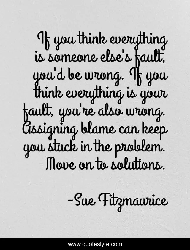 This page presents the quote "If you think everything is someone else's fault, you'd be wrong. If you think everything is your fault, you're also wrong. Assigning blame can keep you stuck in the problem. Move on to solutions.". Author of this quote is Sue Fitzmaurice. This quote is about blame, fault, solutions,.