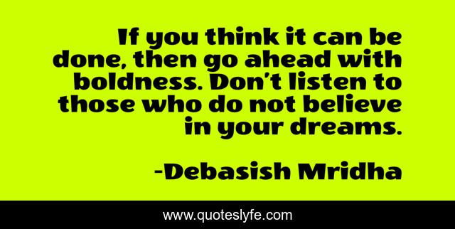 This page presents the quote "If you think it can be done, then go ahead with boldness. Don’t listen to those who do not believe in your dreams.". Author of this quote is Debasish Mridha. This quote is about confidence, philosophy, debasish-mridha, believe-in-your-dreams, quotes, if-you-think-it-can-be-done, inspirational, enthusiasm, debasish-mridha-m-d,.
