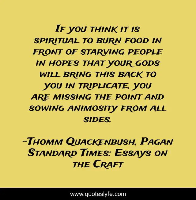 This page presents the quote "If you think it is spiritual to burn food in front of starving people in hopes that your gods will bring this back to you in triplicate, you are missing the point and sowing animosity from all sides.". Author of this quote is Thomm Quackenbush, Pagan Standard Times: Essays on the Craft. This quote is about gods, sacrifice,.