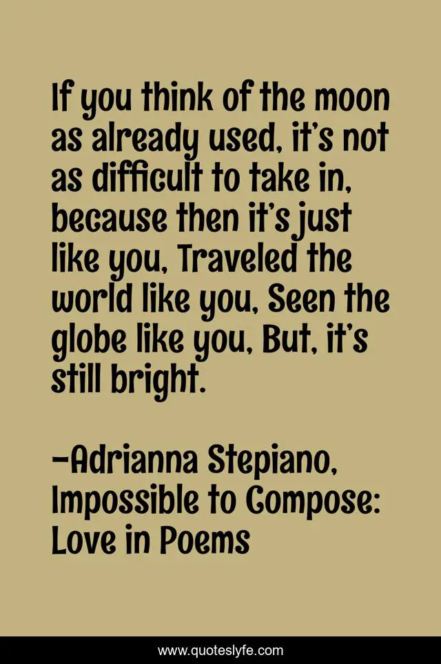 This page presents the quote "If you think of the moon as already used, it’s not as difficult to take in, because then it’s just like you, Traveled the world like you, Seen the globe like you, But, it’s still bright.". Author of this quote is Adrianna Stepiano, Impossible to Compose: Love in Poems. This quote is about heartache, longing, used, love, coping, moon, breakups, earth, pain,.