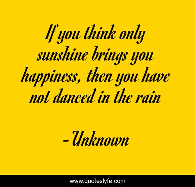 This page presents the quote "If you think only sunshine brings you happiness, then you have not danced in the rain". Author of this quote is Unknown. This quote is about happiness, sunshine, danced, rain,.